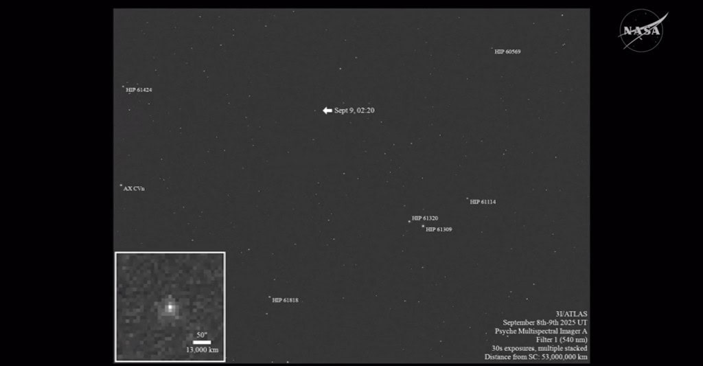 A sonda Psyche, destinada a estudar o asteroide metálico de mesmo nome, realizou quatro observações nos dias 8 e 9 de setembro, a 53 milhões de quilômetros de distância, ajudando a refinar a trajetória do 3I/ATLAS.