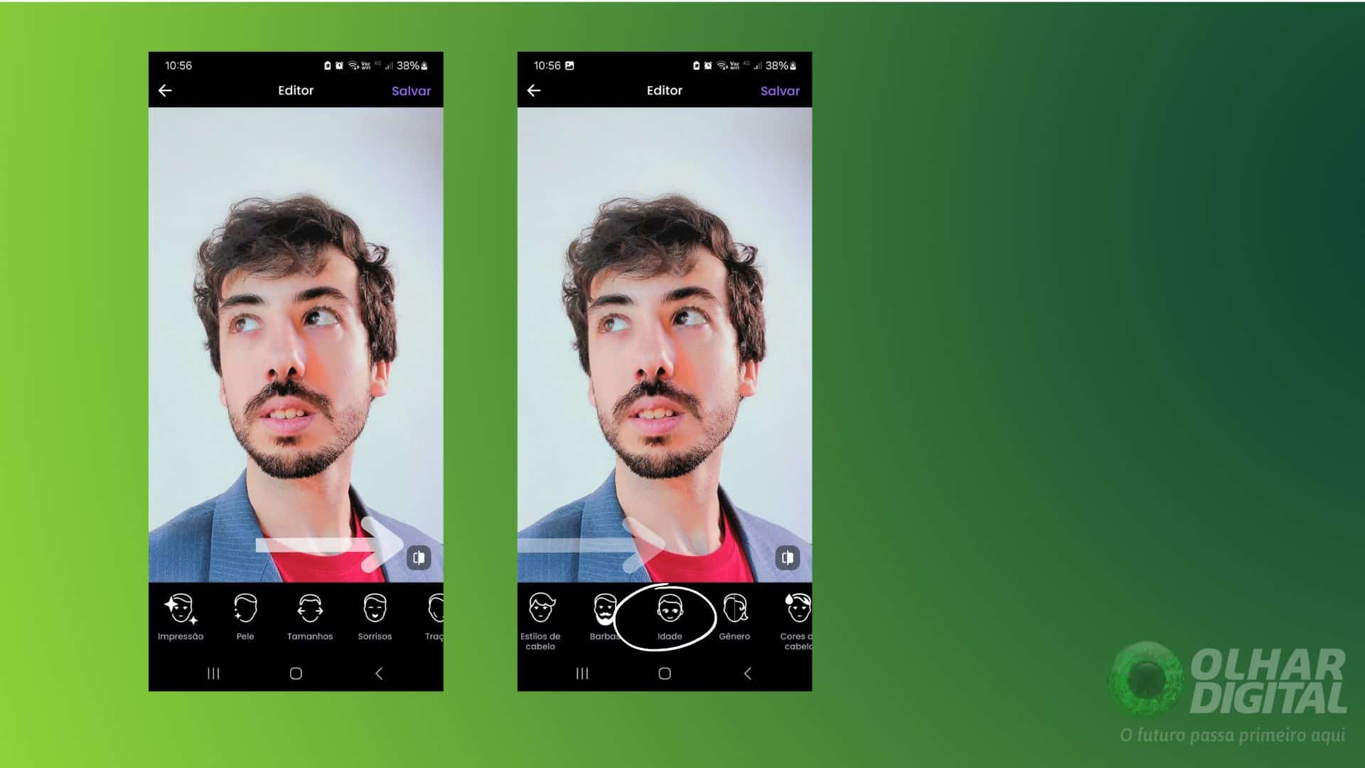 Após isso, toque sobre a barra de ferramentas com desenhos de rostos, arraste para sua esquerda até chegar na opção idade e toque sobre ela.