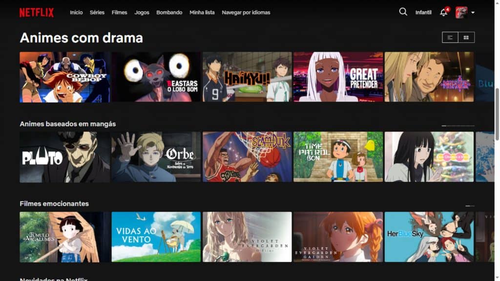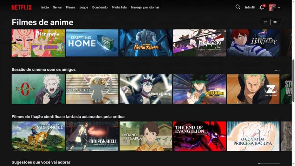 Aqui ficam os filmes de anime, incluindo grandes produções do Studio Ghibli, longas de franquias como “Naruto”, “One Piece”, “Nanatsu no Taizai”, e filme como “The First Slam Dunk” e “A Rosa de Versalhes”. É a categoria mais útil para quem busca obras fechadas, histórias únicas ou adaptações cinematográficas.
