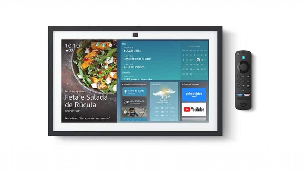 O Echo Show 15 usa uma tela Full HD de 15,6 polegadas, pensada para servir como painel central da casa. Ele pode ser instalado na parede ou apoiado com suporte, exibindo agendas, listas, widgets de organização e conteúdos multimídia. A versão mais recente traz integração com Fire TV, permitindo assistir a streaming direto pelo dispositivo, além de controle por voz e compatibilidade com controle remoto. A tela grande facilita videoconferências, exibição de fotos e uso da Alexa para rotinas mais visuais.