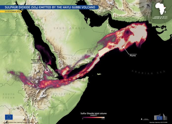 A erupção do Hayli Gubbi lançou uma nuvem de cinzas de pelo menos 13.700 metros de altura. Inicialmente, ela foi levada para o nordeste, cobrindo Iêmen e Omã. Já na segunda-feira (24), a nuvem continuou se espalhando pelo norte da Índia e chegou em partes da China.