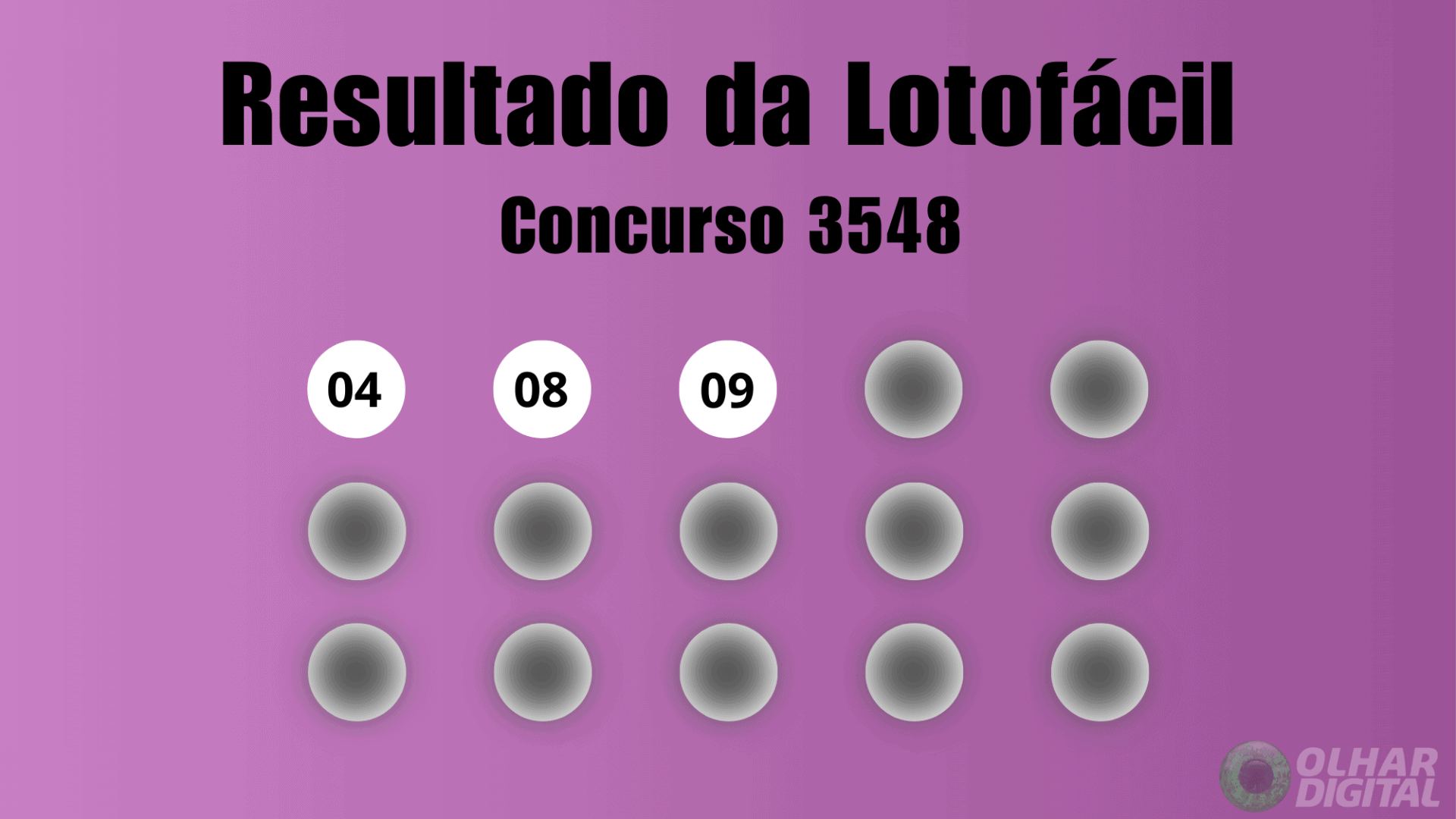 Os números sorteados da Lotofácil 3548 foram:04 – 08 – 09 – 10 – 11 – 12 – 13 – 15 – 16 – 17 – 19 – 21 – 23 – 24 – 25.