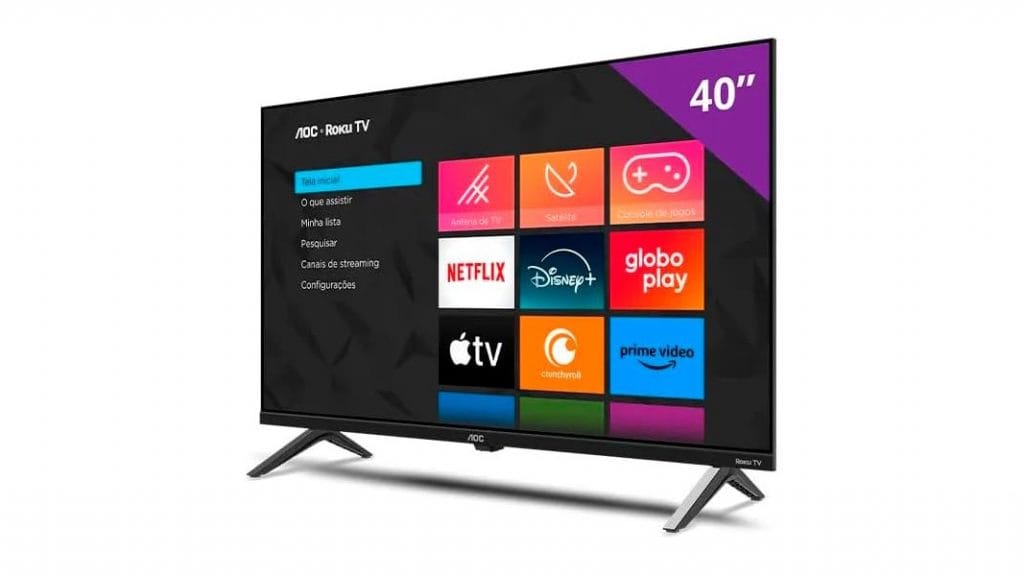 A Smart TV AOC Roku TV de 40 polegadas usa um painel DLED com resolução Full HD. Esse tipo de tela trabalha com iluminação traseira direta, o que ajuda a distribuir a luz por toda a superfície e exibir imagens dentro do padrão esperado para essa faixa de resolução.