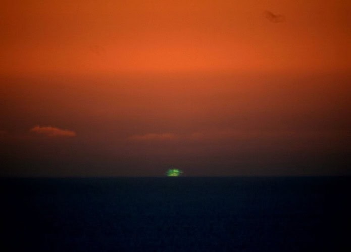 - Raio verde por miragem superior (mock-mirage): Esse tipo ocorre quando há uma camada fria próxima à superfície e uma camada quente acima. O observador precisa estar acima dessa formação. O efeito “pinça” parte do topo do Sol, criando uma lâmina verde fina.