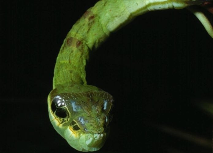 A lagarta-cobra usa um disfarce impressionante para enganar predadores. Quando se sente ameaçada, ela infla a parte frontal do corpo e cria a aparência de uma cabeça de serpente, com manchas que lembram olhos grandes.
