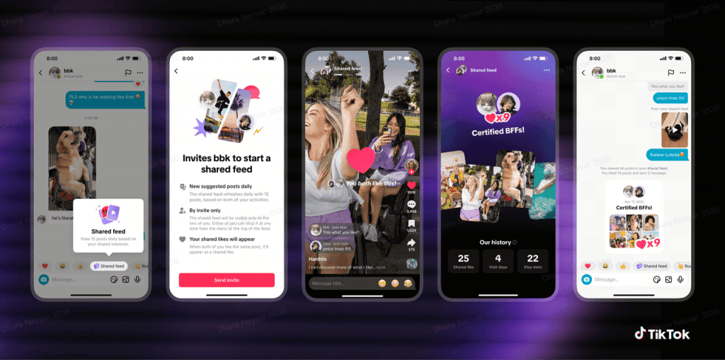 Já os Feeds Compartilhados funcionam como um “para você” conjunto. Criados a partir de uma conversa direta, eles exibem diariamente uma seleção de 15 vídeos personalizada a partir do comportamento dos dois usuários — como curtidas, comentários e tempo de visualização.