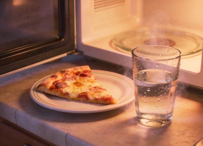 Adicionar um copo de água ao micro-ondas junto com a fatia de pizza é a técnica mais popular e eficaz para um reaquecimento ideal. O princípio é baseado na forma como o micro-ondas interage com a umidade.