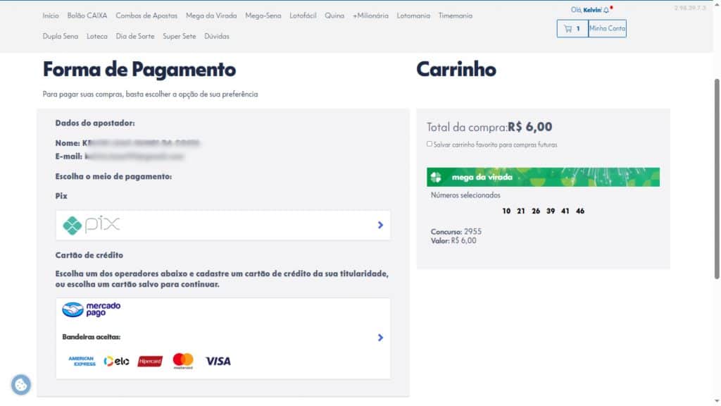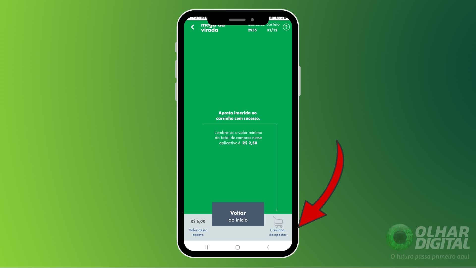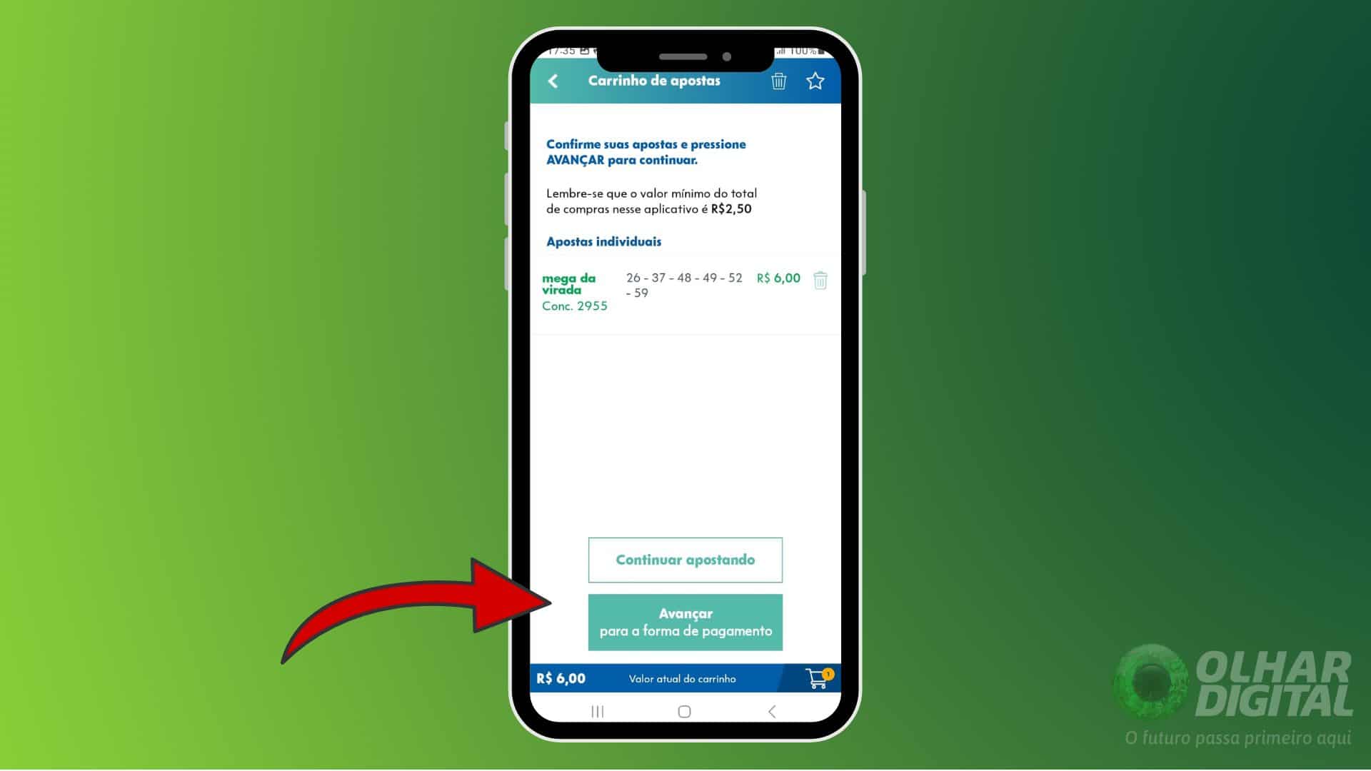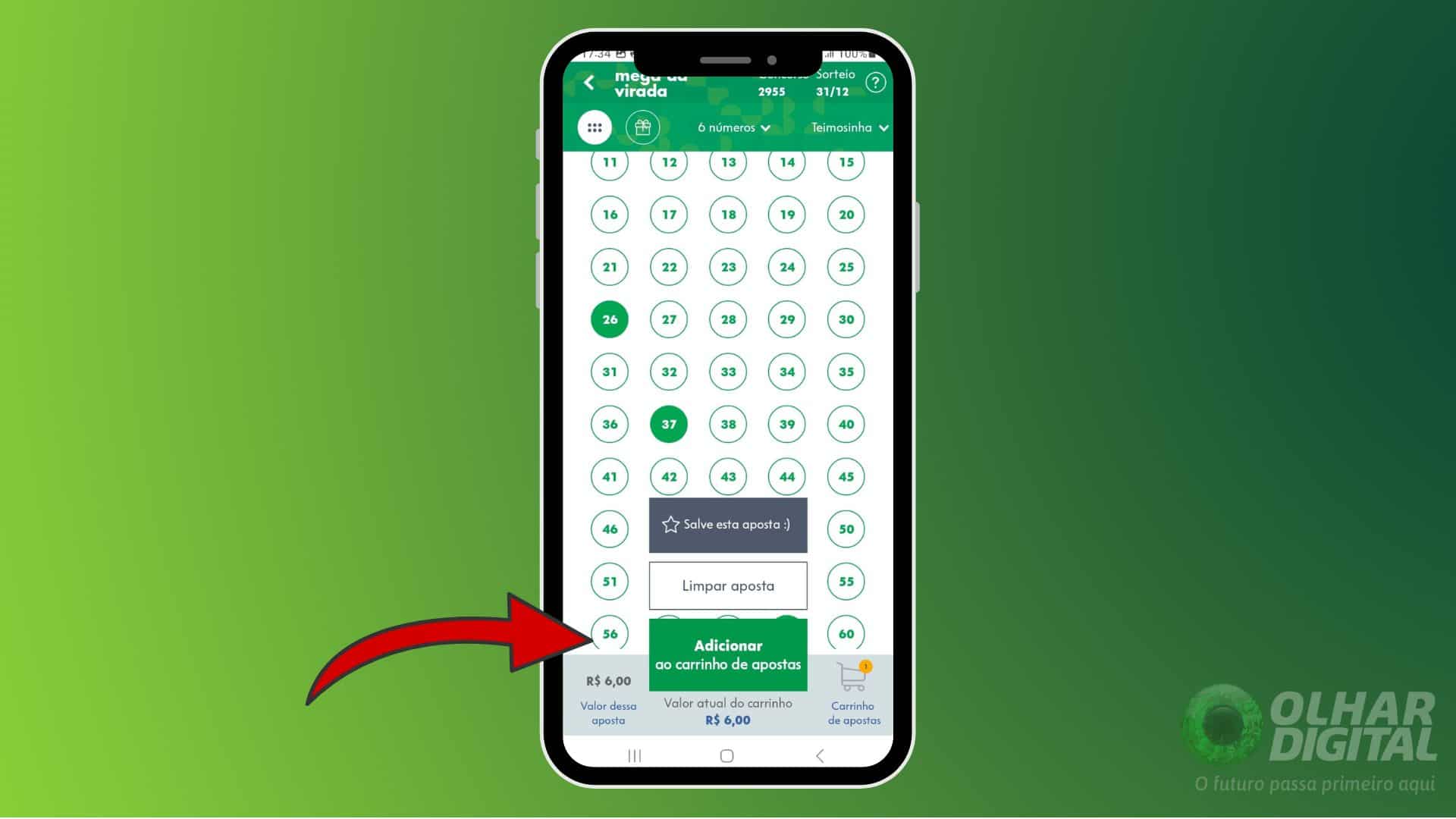 Após escolher seus números, toque em “Adicionar ao carrinho”. O app confirma a inclusão da aposta. Você pode continuar apostando, se quiser aumentar suas chances, ou seguir diretamente para o pagamento.
