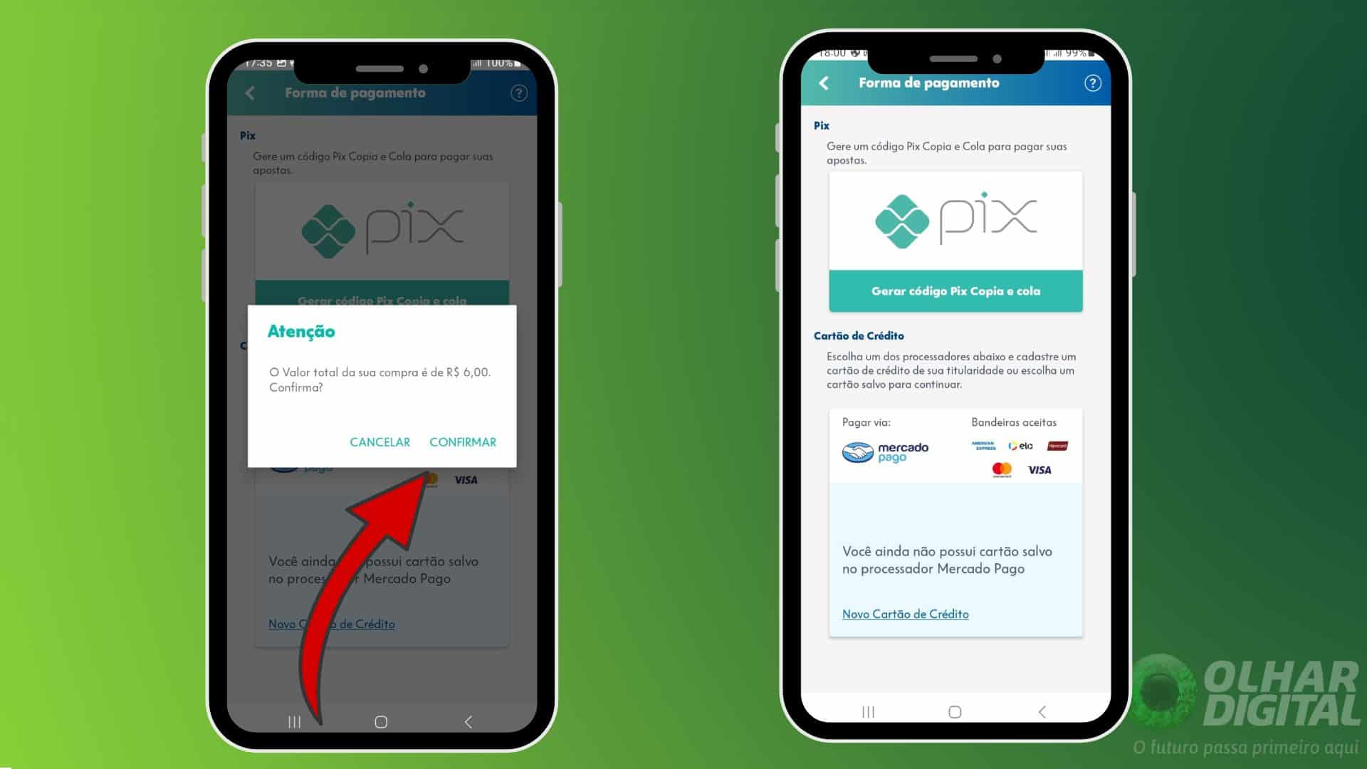 Escolha entre Pix ou cartão de crédito via Mercado Pago. Confirme o valor e finalize a transação. A aposta é registrada imediatamente e aparece no histórico do app.