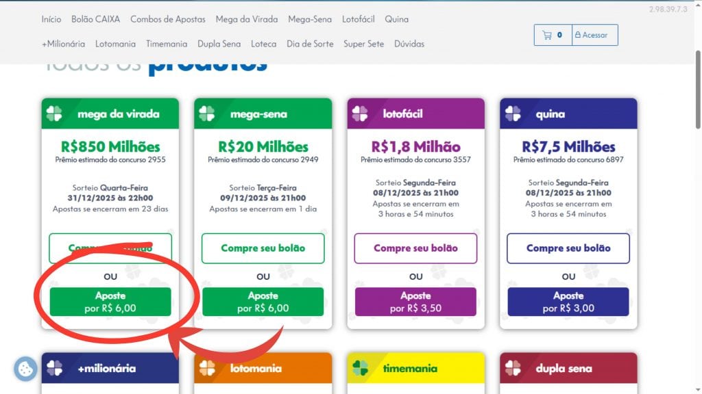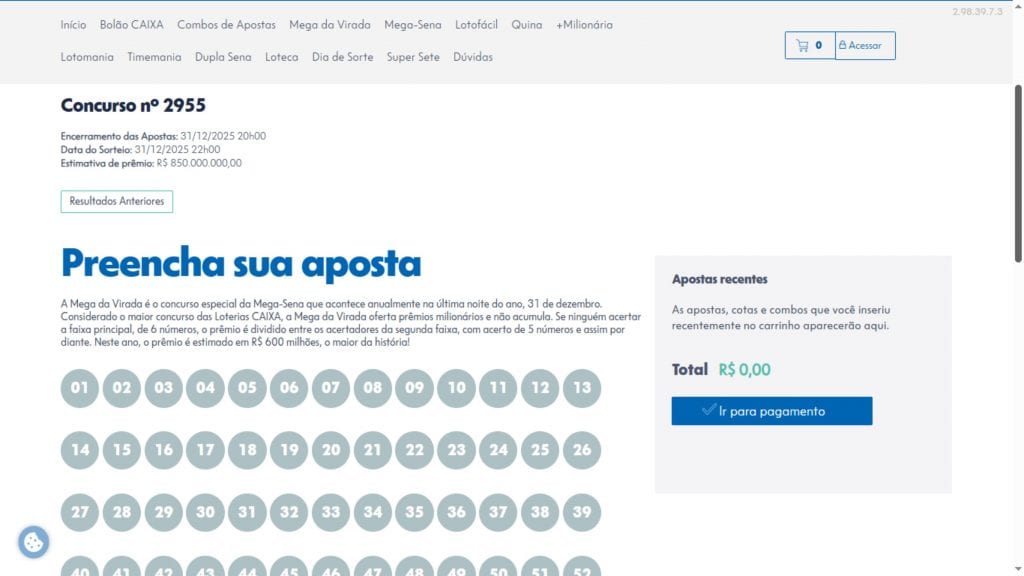 - Passo 3 – Encontre a Mega da Virada: Role a página até localizar a Mega da Virada. O site mostra o valor estimado do prêmio e o botão para iniciar uma aposta simples.