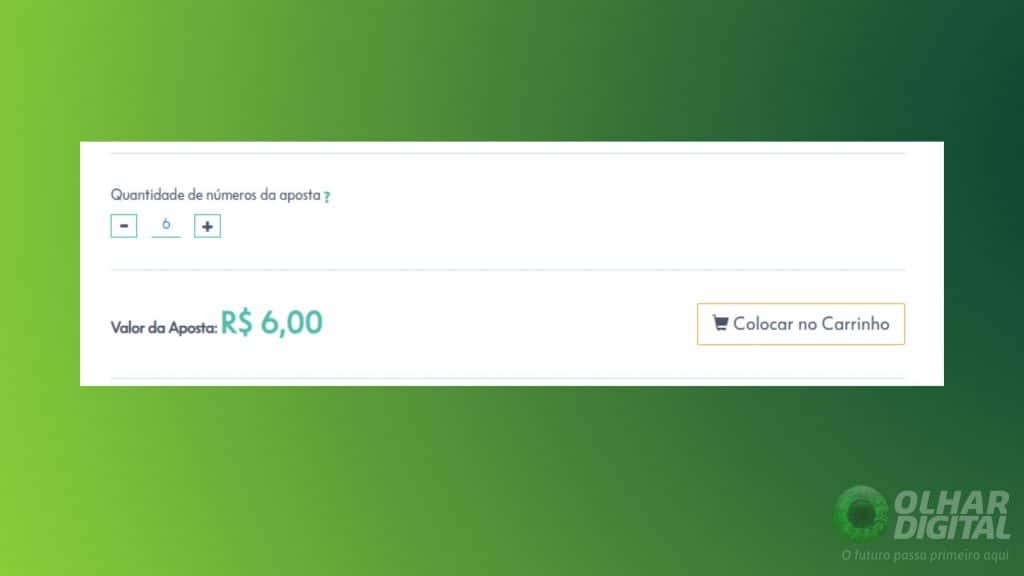- Passo 5 – Coloque no carrinho: Após definir a combinação, clique em “Colocar no carrinho”. O site permite adicionar outras apostas antes de finalizar.