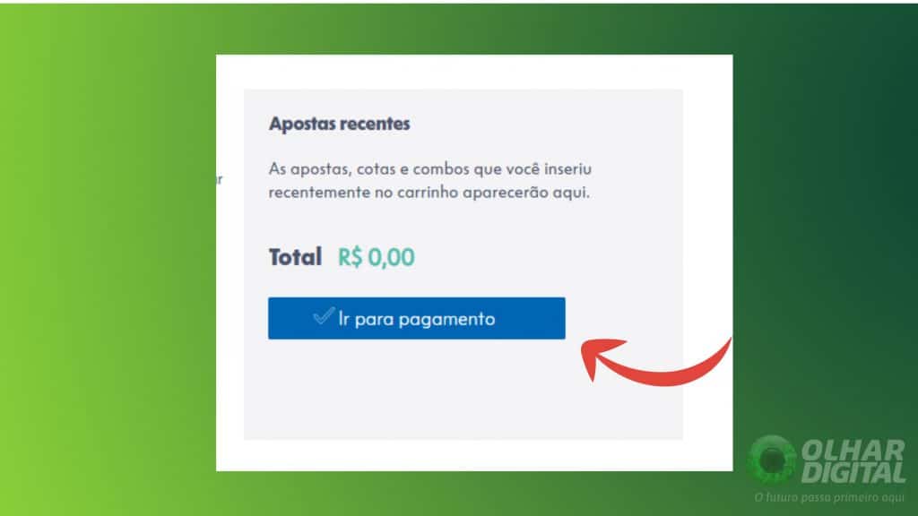- Passo 6 – Acesse o carrinho de apostas: No topo da página, clique em “Apostas recentes” e selecione “Ir para pagamento”. O sistema mostra todas as apostas feitas, o valor total e a opção de continuar ou remover itens.