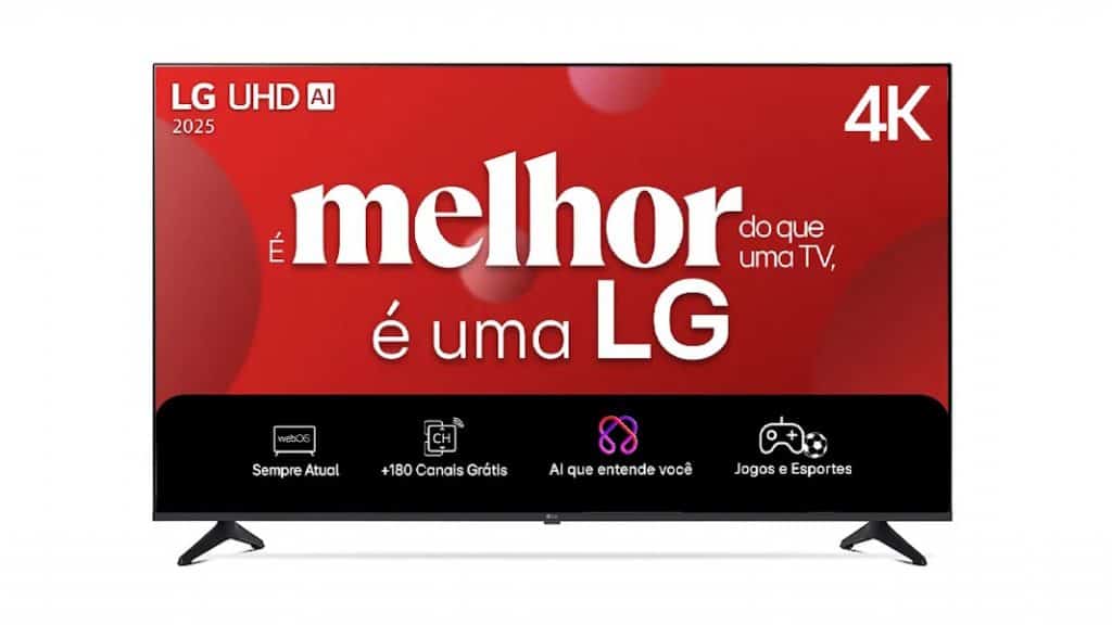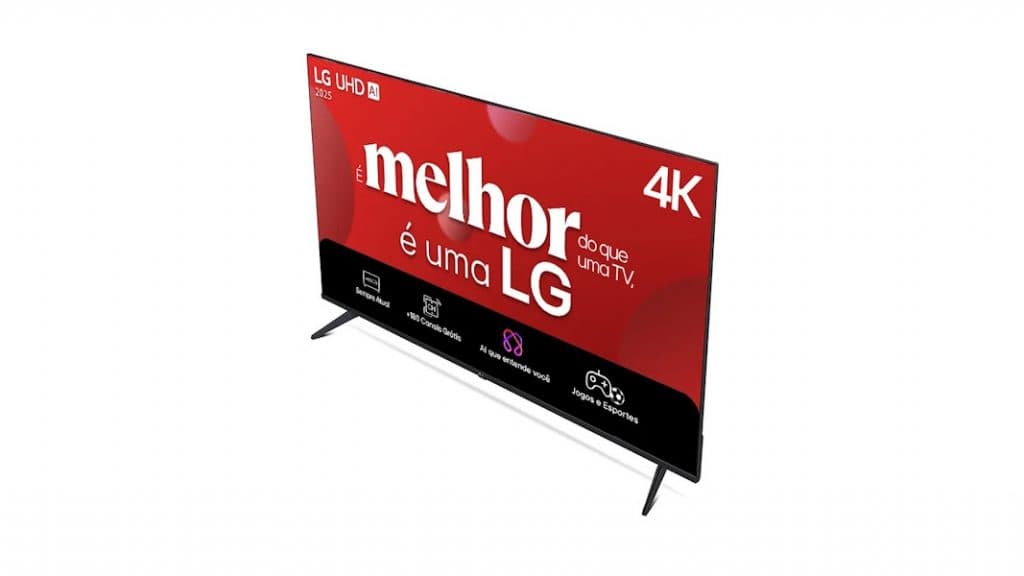 O sistema operacional é o WebOS 25, que organiza aplicativos, configurações e serviços de streaming em uma interface única. Os principais apps já aparecem na tela inicial, e novos podem ser instalados pela loja interna.