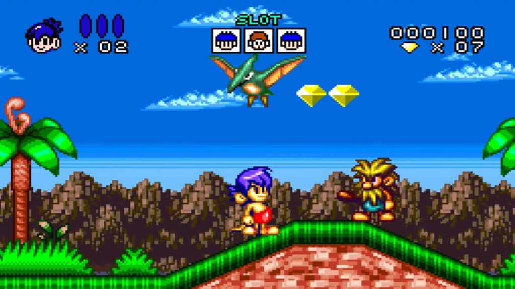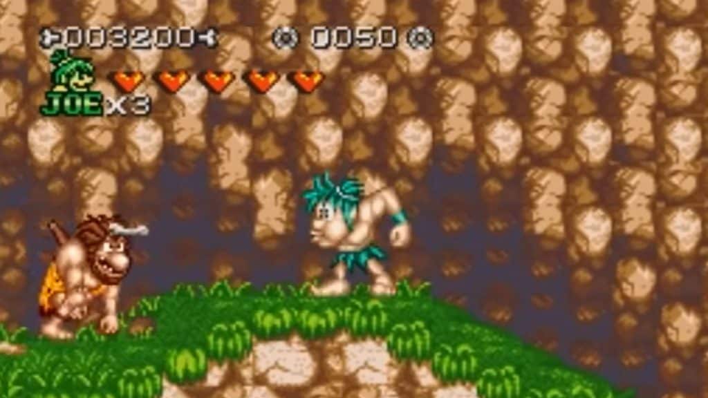 O game permite 2 jogadores, que podem escolher Joe ou Mac, dois homens das cavernas que enfrentam neandertais e dinossauros em uma aventura com muita ação.