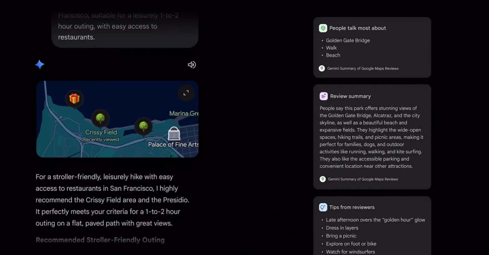 Em buscas como “melhores restaurantes perto de mim”, o Gemini apresenta várias opções organizadas, com imagens e informações úteis logo de cara. O mesmo acontece em pesquisas por atividades, como coisas para fazer com crianças, que mostram parques, museus e outras opções próximas.