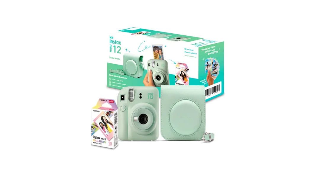 A Instax Mini 12 é uma câmera instantânea que imprime fotos no formato Mini logo após o clique. O kit acompanha 10 filmes instantâneos e uma bolsa para transporte. O modelo trabalha com exposição automática, flash integrado e lente fixa, operando com controles simples. As fotos são reveladas em poucos segundos.