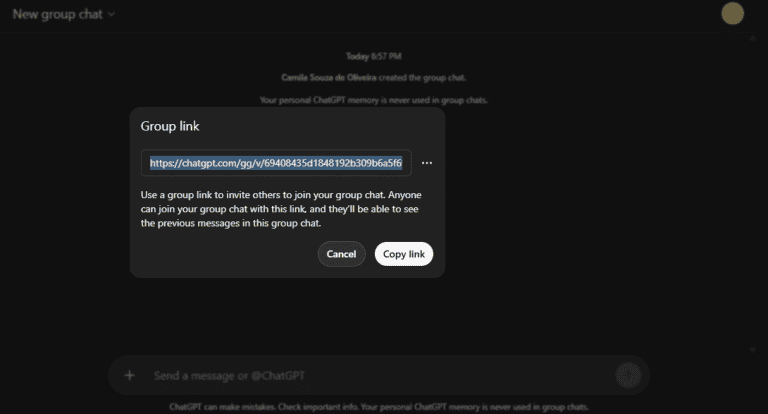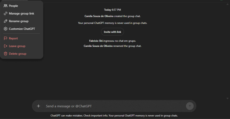 Vale destacar que todos os participantes precisam aceitar o convite para entrar no grupo. A partir disso, passam a ter acesso à conversa e podem interagir normalmente, enviando mensagens e fazendo perguntas ao ChatGPT.