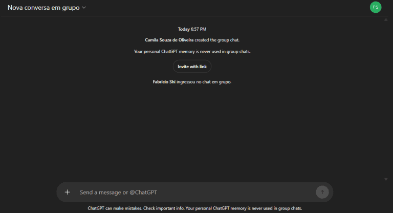 - Com o grupo criado, é possível continuar usando o ChatGPT da mesma forma que em um chat individual.