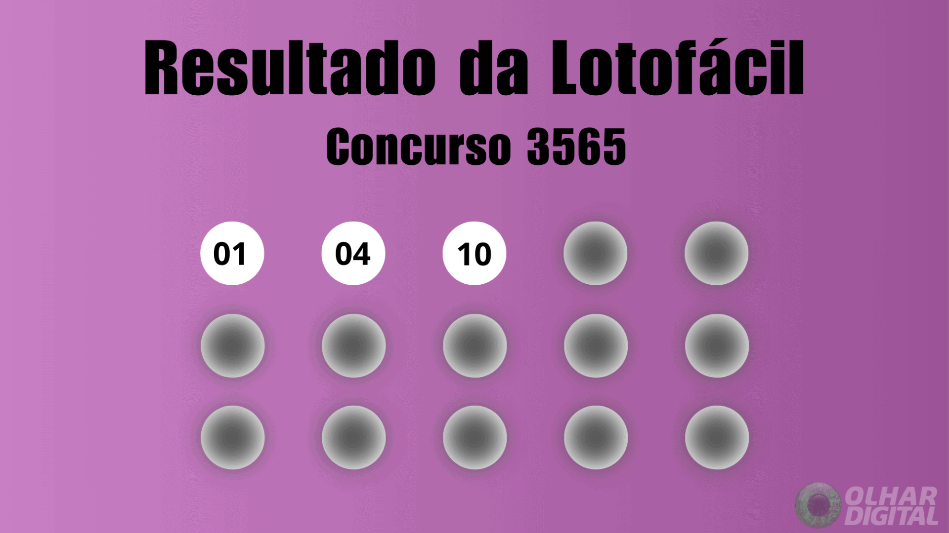 Os números sorteados da Lotofácil 3565 foram: 01 – 04 – 10 – 11 – 13 – 16 – 17 – 18 – 19 – 20 – 21 – 22 – 23 – 24 – 25.