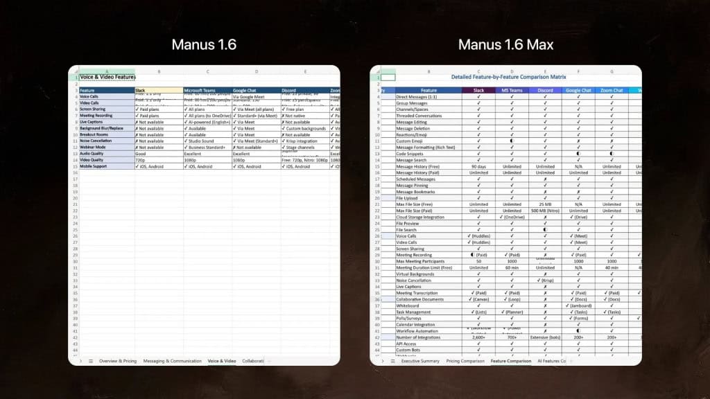 A Manus menciona ainda a capacidade do Max de criar matrizes detalhadas de comparação de recursos, voltadas para análises concorrenciais mais amplas, com múltiplas dimensões de dados.