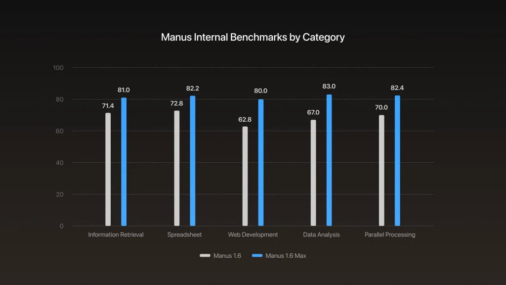 No centro da atualização está o Manus 1.6 Max, descrito como o agente mais poderoso já lançado pela plataforma. A empresa afirma que o Max apresenta um aumento mensurável de desempenho, resultado de uma arquitetura mais avançada para planejamento e solução de problemas.