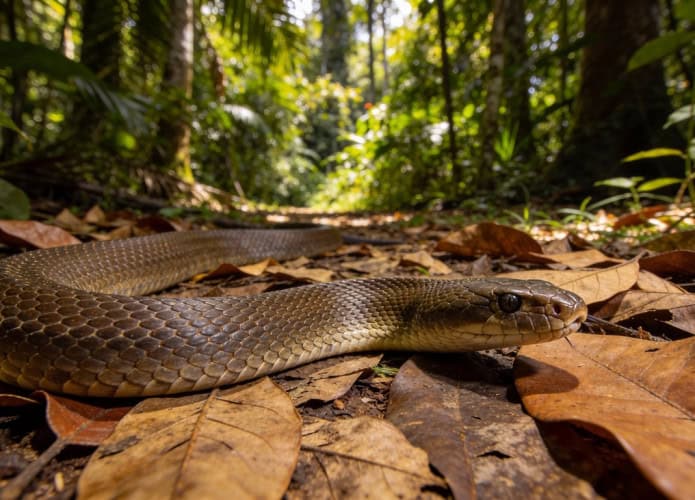 🌲 Surucucu-pico-de-jaca (Lachesis muta)A maior serpente peçonhenta das Américas, que exige áreas de floresta primária preservada para sobreviver.