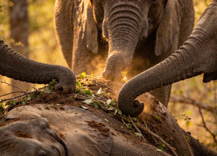 🌿 Sepultamento simbólicoOs elefantes utilizam suas trombas e patas para cobrir o corpo do falecido com terra, galhos e folhagens, criando uma espécie de túmulo.
