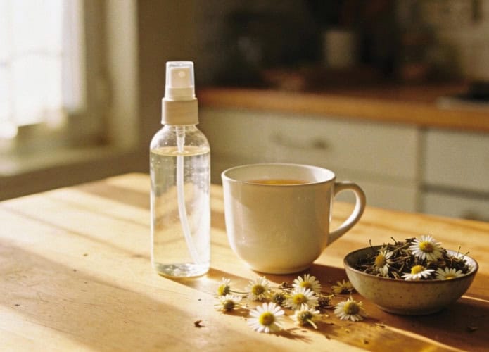 Ferva a água, adicione a camomila, deixe esfriar naturalmente e coe antes do uso.