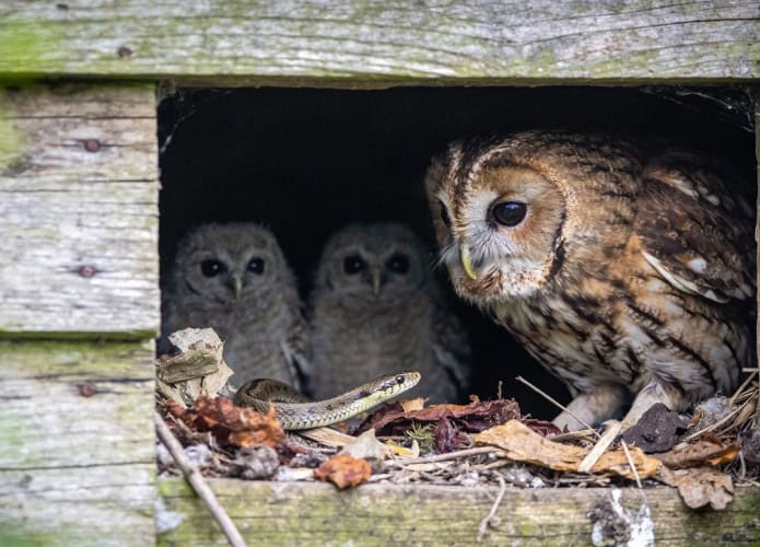 Pesquisadores observaram que as corujas são muito seletivas ao trazer as cobras. Elas as entregam inteiras e prontas para trabalhar. Abaixo, veja uma comparação entre o que acontece em ninhos que possuem essa parceria inusitada e aqueles que dependem apenas dos cuidados convencionais da mãe coruja.