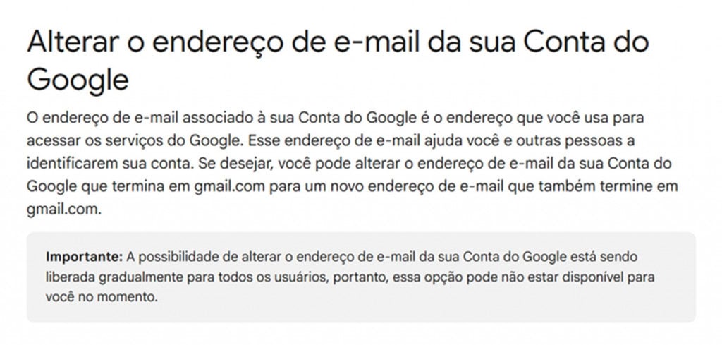 Em uma página de suporte do Google, a empresa escreveu que está implementando uma nova opção que permitirá usuários alterar seus endereços de e-mail do Gmail – o @gmail.com.