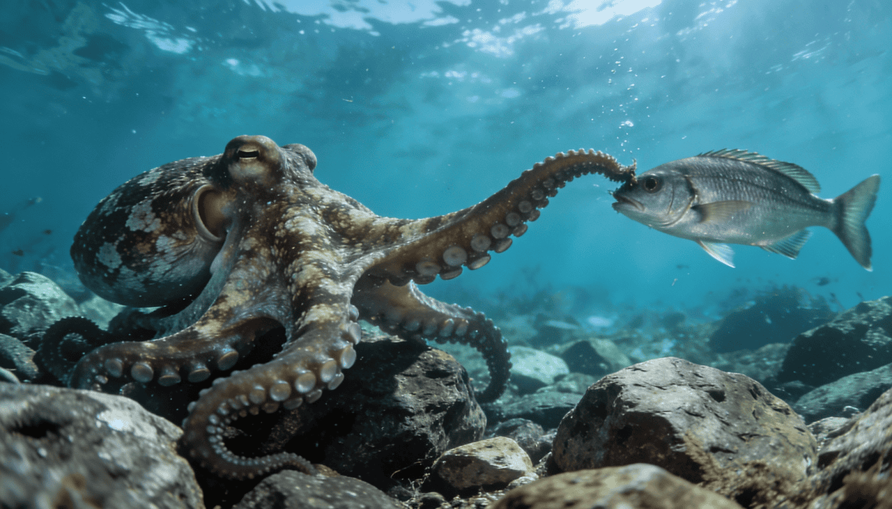🥊 O golpe corretivoQuando um peixe tenta tirar vantagem ou atrapalha a estratégia, o polvo desfere um soco rápido para impor respeito.
