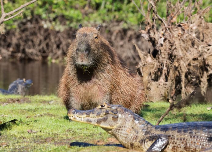 As capivaras são os maiores roedores do mundo e vivem em grupos próximos a rios, lagos e pântanos, exatamente os mesmos ambientes onde crocodilianos e jacarés caçam.