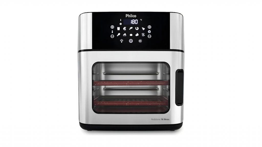 A Air Fryer Philco PAF16A tem capacidade total de 16 litros e oferece um espaço interno amplo para acomodar diferentes tipos de alimentos. O compartimento permite usar grelhas e bandeja de forma combinada, facilitando a organização dos itens durante o preparo.