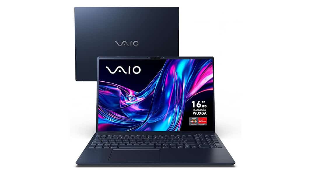 O VAIO FE16 vem equipado com processador AMD Ryzen 7-5825U, 32 GB de RAM e SSD de 512 GB, rodando Linux de fábrica. O conjunto atende aplicações que exigem mais memória e processamento. A tela tem 16 polegadas, resolução WUXGA (1920 × 1200), painel IPS e acabamento antirreflexo.
