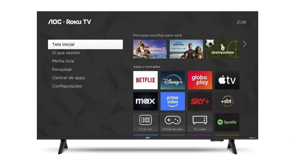 A Smart TV AOC inclui conversor digital integrado, compatível com o padrão brasileiro de TV aberta, além de recursos comuns do sistema Roku, como guia de canais, espelhamento de tela com dispositivos compatíveis e atualizações automáticas de software via internet.