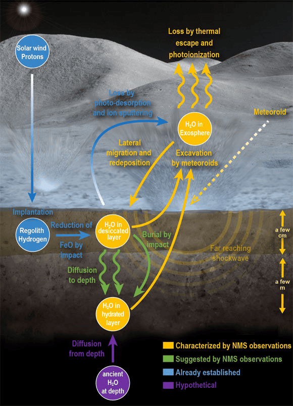 Sem a proteção atmosférica que temos na Terra, esses grãos microscópicos atingem diretamente o solo lunar a dezenas de quilômetros por segundo. Quando isso ocorre, a energia do impacto libera moléculas de água que estavam presas ali, lançando-as temporariamente na exosfera lunar.