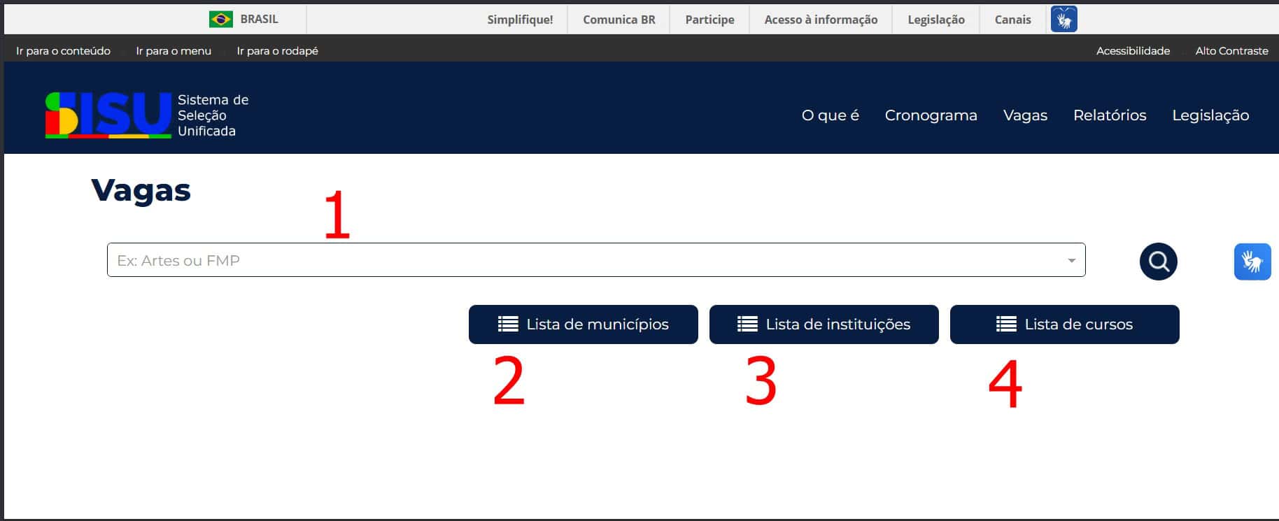Há quatro formas possíveis de pesquisar por um curso e encontrar suas vagas: 1) digitar nome do curso, instituição ou cidade na barra de busca; 2) clicar no botão que mostra a lista de municípios, separados por estados, que detém instituições com vagas; 3) acessar a lista completa de instituições; 4) verificar a lista completa de cursos.