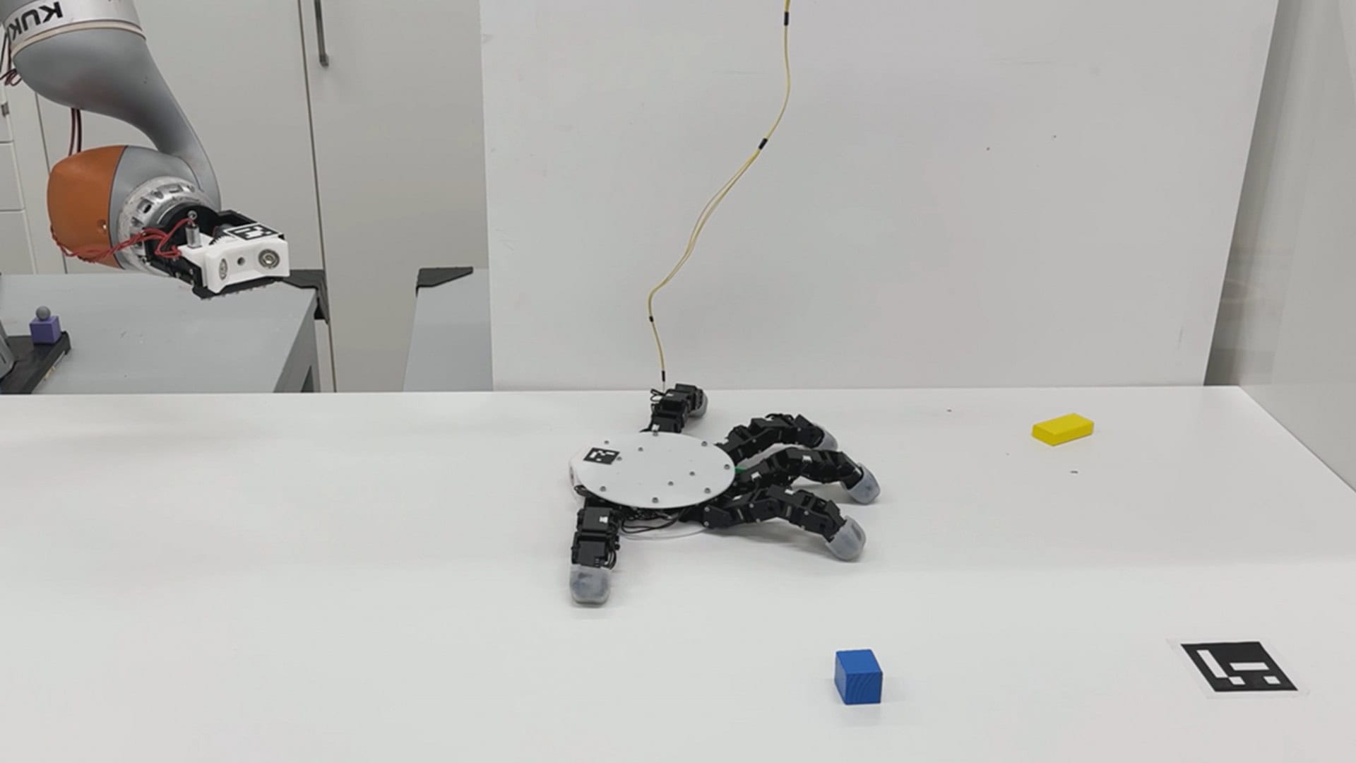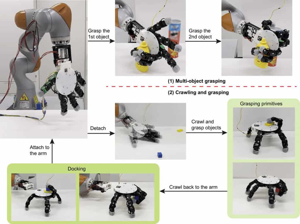 Um dos aspectos que mais chamou atenção do projeto é a capacidade da mão se desacoplar do restante do robô e andar sozinha. Nessa configuração, ela se transforma em um pequeno robô rastejante, se movendo pela superfície usando os dedos como se fossem pernas. Em alguns casos, o sistema utiliza os nós dos dedos para se mover, ao mesmo tempo que pode usar as extremidades para manipular objetos.