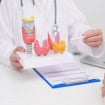 Imagem mostra médico apontando para modelo tireoidiano para hipertireoidismo, hipotireoidismo, tireoidite de Hashimoto, tumor e câncer da tireoide, carcinoma papilar