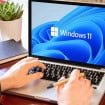 Homem utilizando um notebook com Windows 11 em uma mesa de madeira