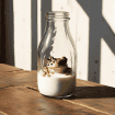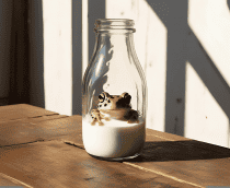 Um sapo está dentro de uma garrafa de vidro transparente com leite, complementado sobre uma mesa de madeira iluminada pela luz do sol