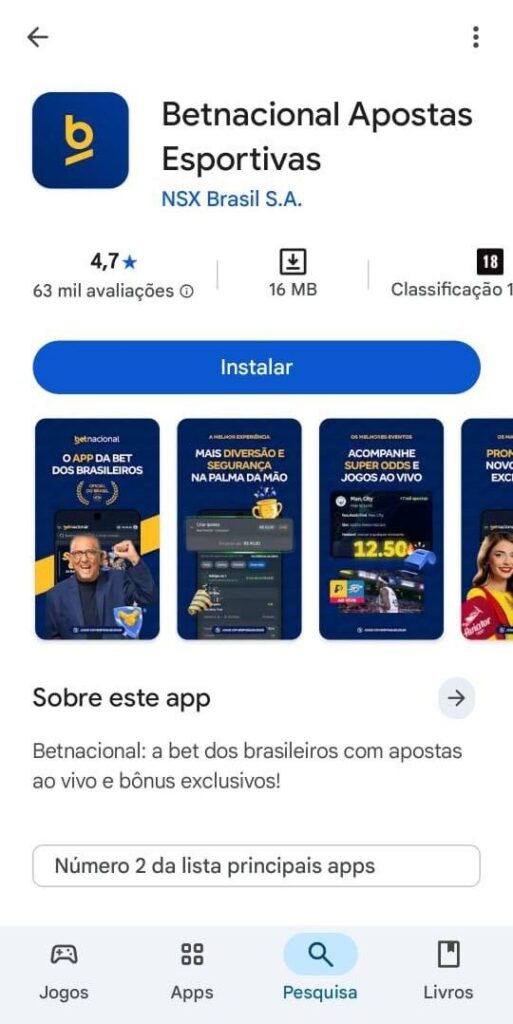 E, começando em 2025, com a regulamentação do mercado brasileiro de apostas esportivas e cassino online, o aplicativo Betnacional está na loja oficial do Android. Ou seja, se você ainda não baixou o Betnacional app, pode encontrar o aplicativo da operadora na Google Play Store.