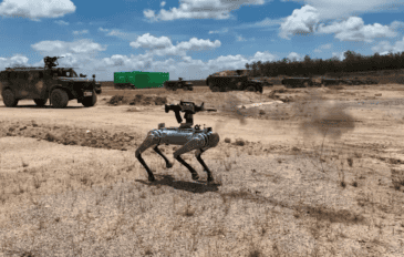 O robô militar equipamento com a arma participou de exercícios militares realizados pela China em conjunto com o Camboja