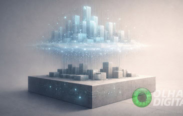 Ilustração de holograma de cidade flutuando sobre cidade em bloco de concreto