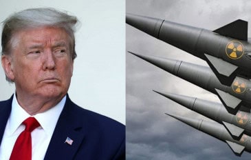 Montagem com fotos de Donald Trump olhando para o lado e de mísseis nucleares apontados para cima na diagonal