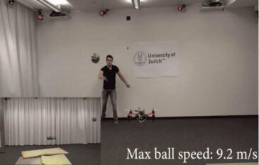 No teste, o sistema autônomo faz o drone esquivar-se de uma bola de futebol com agilidade