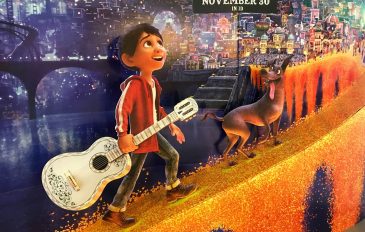 menino Miguel e seu cachorro sobem a rampa dourada no filme