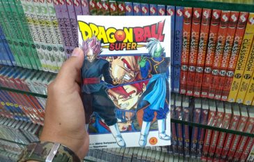 mão de home segurando uma revista de mangá com o título Dragon Ball Super