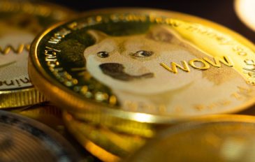 Moedas douradas, onde uma mais destacada está com a imagem do cachorro da moeda Dogecoin