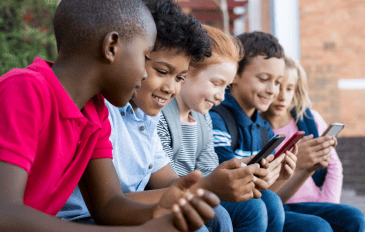 Crianças sentadas e mexendo em celulares